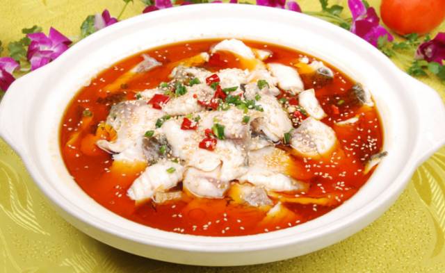8、鱼片煮熟就连汤倒到酸菜垫底的盘子。用猛油爆香辣椒干后淋到鱼身上即可